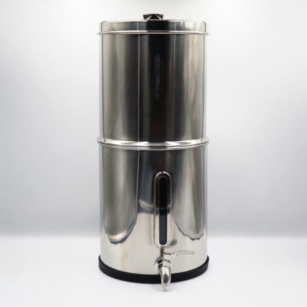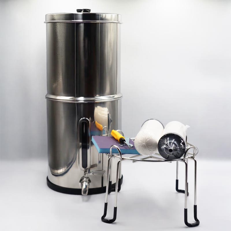 - La cuve de filtration par gravité comprend: 2 filtres (charbon actif / céramique), papier abrasif (mise en route des filtres), pied (hauteur 19cm), cuves (1 supérieure et 1 basse avec fenêtre visualisation niveau eau filtrée), couvercle, robinet inox, clé plate et tourne-vis
