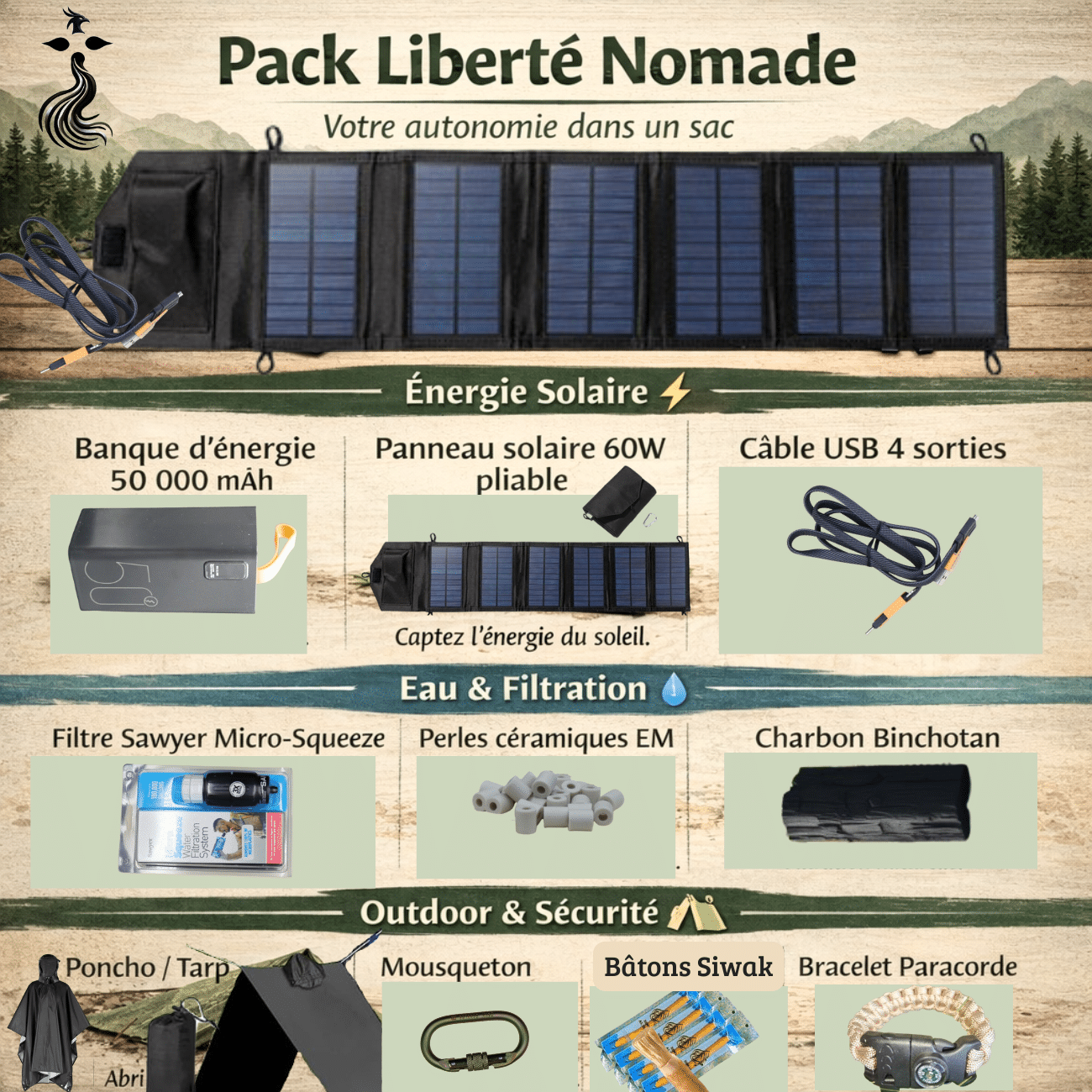 Compact, polyvalent et durable, le pack Liberté – Nomade incarne la résilience et la liberté de mouvement — l’essentiel pour vivre en harmonie avec la nature, sans dépendre du réseau.